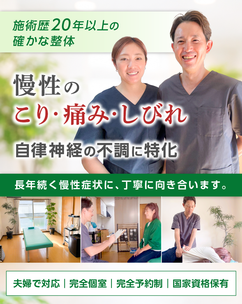 そこでたどり着いたのがこちらの整体院でした。先生の説明もわかりやすく丁寧にして下さり、質問もしやすい雰囲気で良かったと思っています。